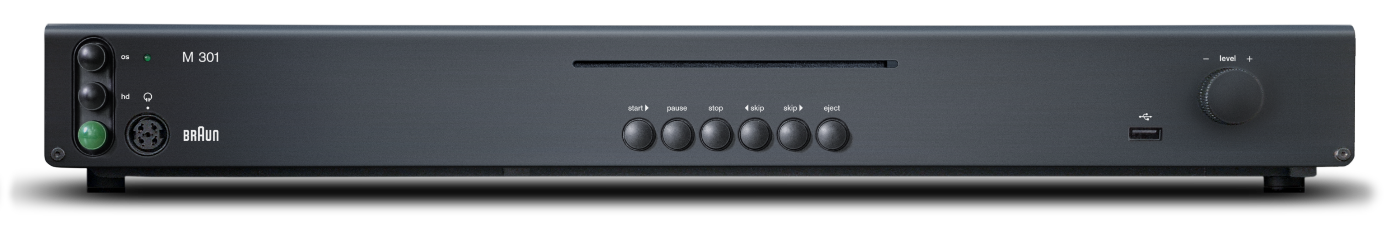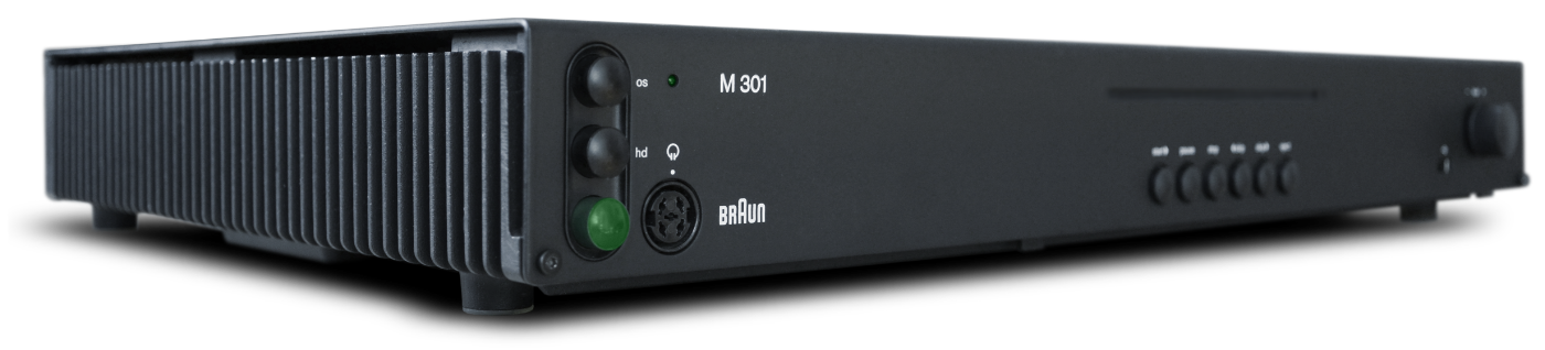 Sebastian Schwarzmeier vom Designbüro Formstation aus Weiden in der Oberpfalz hat, dank Hilfestellung aus dem Braun Forum und der Unterstützung von Fachkräften vor Ort, die Arbeit der beiden Ästheten Rams und Ive im M 301 vereint. Gehäusegestaltung und Anordnung der Bedienelemente folgen dem Slim Line Konzept von Braun HiFi und orientieren sich so nah wie möglich an den vorhandenen Studio Line Geräten aus dem Jahr 1978. Somit wird auch beim M 301 bewusst auf Schubladen oder ein Display verzichtet. Im Inneren dieses Media Centers schlägt das Herz eines Mac mini und auch die Optik der Laufwerköffnung mit dem geschickt platzierten Infrarotempfänger ist dem letzten Modell mit optischem Laufwerk entnommen.